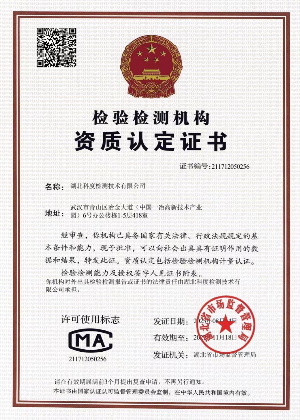 湖北科度檢測(cè)技術(shù)有限公司是一家專(zhuān)業(yè)從事環(huán)境類(lèi)及相關(guān)領(lǐng)域檢測(cè)的第三方檢測(cè)機(jī)構(gòu),公司已通過(guò)湖北省市場(chǎng)監(jiān)督管理局CMA計(jì)量認(rèn)證,可以面向社會(huì)出具權(quán)威CMA檢測(cè)報(bào)告。 我公司實(shí)驗(yàn)室嚴(yán)格按照國(guó)家標(biāo)準(zhǔn)建設(shè),擁有一大批國(guó)內(nèi)外先進(jìn)儀器設(shè)備及現(xiàn)代化配套設(shè)施,并有經(jīng)驗(yàn)豐富的中高級(jí)專(zhuān)業(yè)技術(shù)人員和嚴(yán)格的實(shí)驗(yàn)室質(zhì)量保證體系為項(xiàng)目運(yùn)作提供強(qiáng)力支撐。 作為第三方檢測(cè)機(jī)構(gòu),公司始終以高度的社會(huì)責(zé)任感經(jīng)營(yíng)企業(yè),以“公正、嚴(yán)謹(jǐn)、高效”為宗旨,依托專(zhuān)業(yè)的技術(shù)實(shí)力為客戶(hù)提供專(zhuān)業(yè)優(yōu)質(zhì)檢測(cè)服務(wù),受到政府、企業(yè)和社會(huì)各界的廣泛關(guān)注和認(rèn)可。